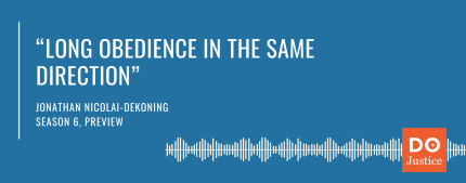 Then at the same time, Jonathan, you're writing as a Do Justice blog columnist and you're the program director, like we've mentioned, at the Micah Centre at the King's University, which helps students to grow a vision for justice and renewal. So you've been thinking and teaching about justice for a while, and your blogs, “Paying Attention in a Distracted and Distracting World,” and the the other blog, “Making Space for Joy in Justice Seeking,” offer some practices for how to stay engaged with this justice work for the long-term mindset and resisting the appeal of the quick fixes. So when both of these things came together, we decided this needed to be our theme for the latest season of Do Justice. And it was back, sort of late August early September, when Megan and Victoria and myself kind of got together, and we started batting this around. And it called to mind this quote from Eugene Peterson, and like I said, this was Megan and Victoria who brought this quote for me. They do all the hard work of, you know, making me sound relatively intelligent and they offered this quote. It's from Eugene Peterson's A Long Obedience in the Same Direction: Discipleship in an Instant Society. And the quote is this: “There is little enthusiasm for the patient acquisition of virtue, little inclination to sign up for a long apprenticeship in what earlier generations of Christians called “holiness.”’ So Jonathan, thanks for joining us here today to set up the next podcast episodes, this series, season 6, and just to discuss with us the practices that have made justice work so sustainable for you. So, I want to jump in. You gave us a really nice outline of what you've been up to, and the work that you do, but I want to go back to the Eugene Peterson quote. What does “long obedience in the same direction,” what has that meant for you? What does that look like for you in Edmonton?