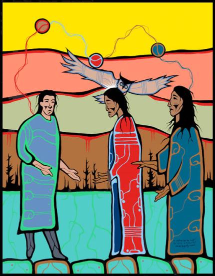 We see also wisdom in this picture. The owl, the spirit of truth, the spirit of love, embracing what is being shared, appears to be blessing the truth teller, the family member, and the witness. The circle is being restored. Brokenness in relationship is being healed.