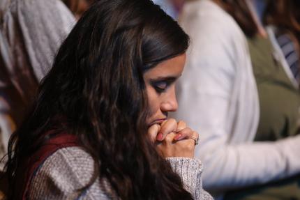 Thompson used this mini-drama to launch into a passionate call for the kids to accept God -- who made them and loves them — into their lives. When the young people raised their hands to indicate they wanted Jesus in their hearts, prayer team volunteers in orange shirts flowed in from the sides, sat, and shared a gospel message with them.