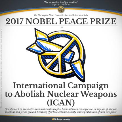 The 2017 Nobel Peace Prize was awarded in Oslo, Norway on Oct. 6 to the International Committee to Abolish Nuclear Weapons (ICAN), a non-governmental organization with members in more than 100 countries. Comprised of a wide-ranging group of churches, individuals, educators, organizations, and others, ICAN played a key role in July this year to get the United Nations to pass the Treaty on the Prohibition of Nuclear Weapons.