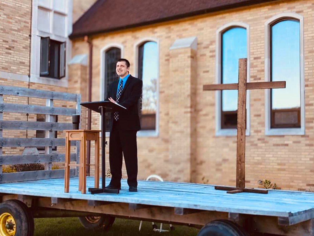 In those early weeks last March, said Hemstreet, Coopersville CRC kept the sanctuary closed. However, in a relatively short time, church leaders came up with the idea of wheeling into the parking lot a hay wagon on which Hemstreet could preach. They obtained an FM radio transmitter and began holding their Sunday service outside for members who came to listen on the radio from their parked cars.