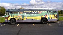 The bus, with a large white dove of peace and "War is Not the Answer" painted on the outside, sat in the parking lot while tour members went inside and gave presentations during the lunch hour.