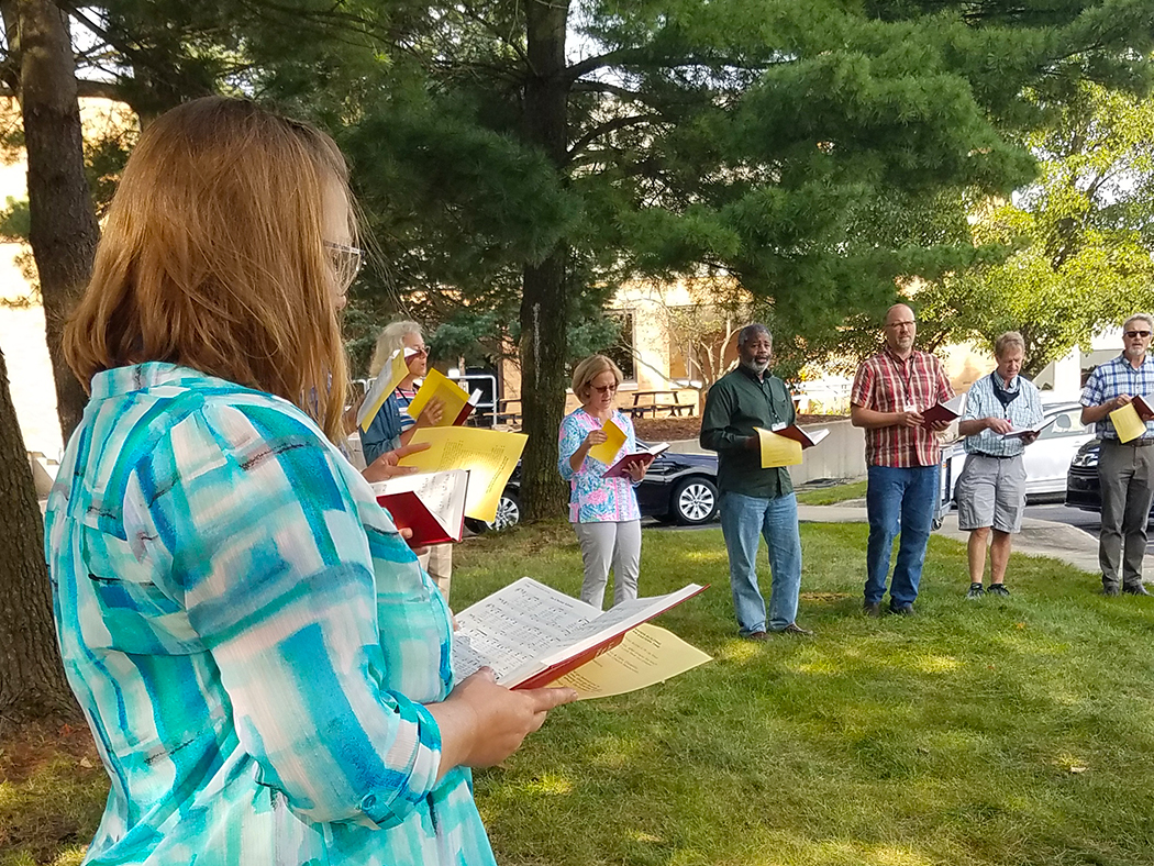 On a day featuring comfortable weather and a welcome breeze, they gathered in a circle between the parking lot and a stand of pine trees to pray.