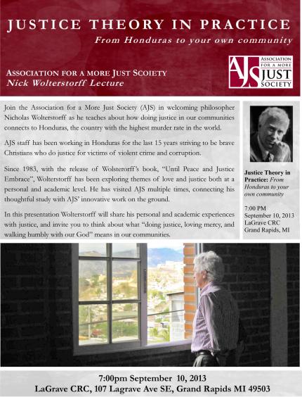 Woltertorff will also invite members of the audience to think about what “doing justice, loving mercy, and walking humbly with our God” means in local communities, says a press release from the Association for a More Just Society (AJS), which is sponsoring his lecture.