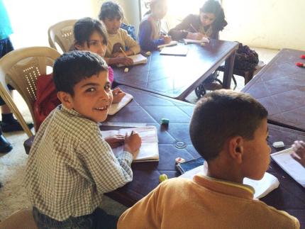 Children at work in a tent school in Lebanon.
